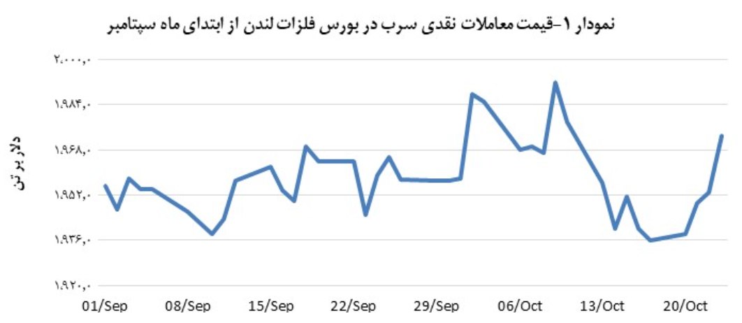 23 اکتبر (1 آبان ماه)، قیمت قراردادهای نقدی سرب در بورس فلزات لندن، 1,973.0 دلار در هر تن عنوان شد که نسبت به پیش 1.0 درصد رشد داشت. شایان ذکر است که نسبت به عملکرد هفتروزه، این عدد نشاندهنده اوج نرخ نقدی سرب در برهه مذکور است.ولی، طی روندی صعودی، مبادلات آتی سرب موفق شد بیشترین نرخ یک هفته اخیر، یعنی 2,010.0 دلار به ازای هر تن، را تجربه کرد.این در شرایطی است که رشد گزارش شده در معاملات نقدی سرب، بالاترین میزان رشد طی یک هفته اخیر بود.بیشترین افزایش روزانه قیمت آتی در هفته گذشته، در همین روز رقم خورد و نرخ را به سطح 2,010.0 دلار برای هر تن رساند.